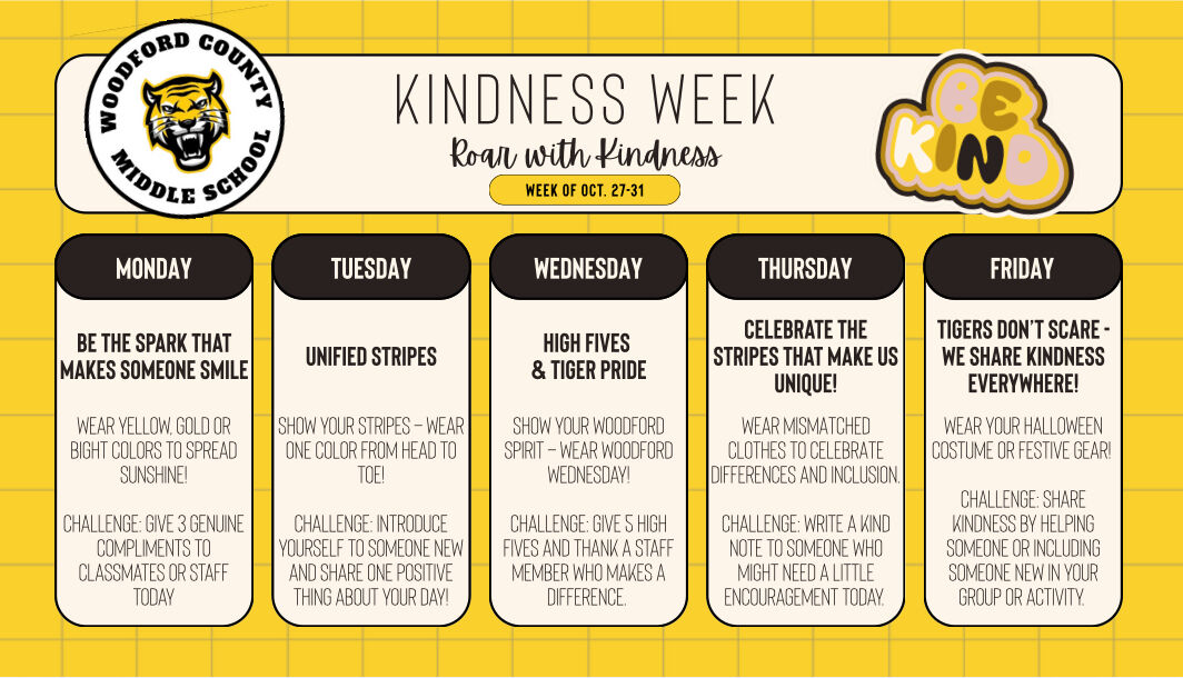 Over this week, Woodford County High School is hosting a Kindness Week. As part of Kindness Week, parents and caregivers at every school will have the opportunity to take a very important online training. The training is a video that centers on keeping children and students safe online. You will hear more information about this training over the course of the week as the Family Resource and Youth Services Coordinator at your student's school will share about the training video, important information from it, and the concluding survey. If you complete the training and the survey at the end of the video, your student will be entered in a drawing for prizes.
